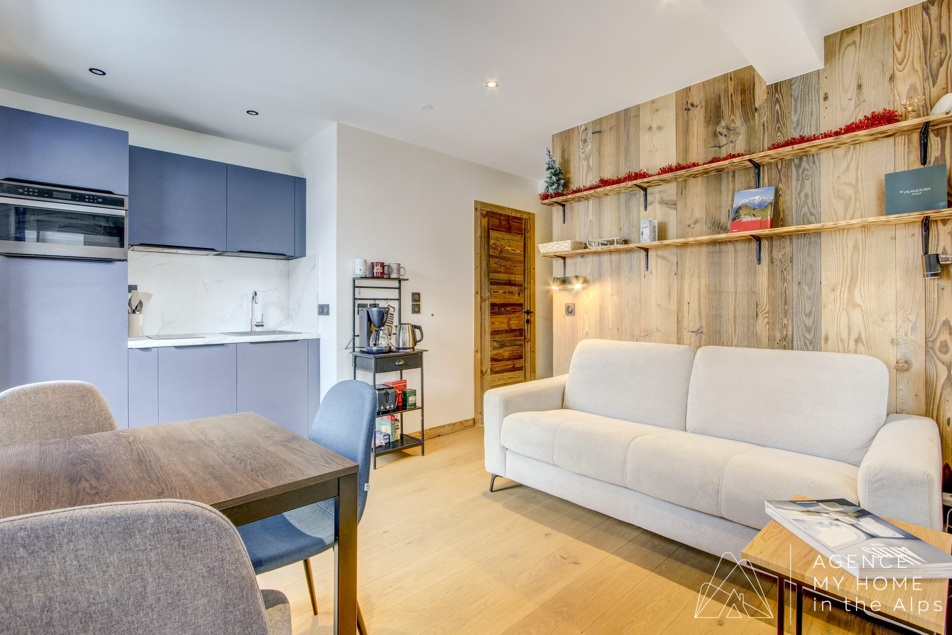 Fully refurbished in February 2025 with high-quality materials, the property combines modern comfort with alpine charm. Reclaimed wood finishes, elegant detailing and a carefully designed layout create a warm and inviting atmosphere throughout. The living space is well optimised, featuring a contemporary kitchen opening onto a cosy lounge area, while the separate bedroom provides a peaceful retreat.