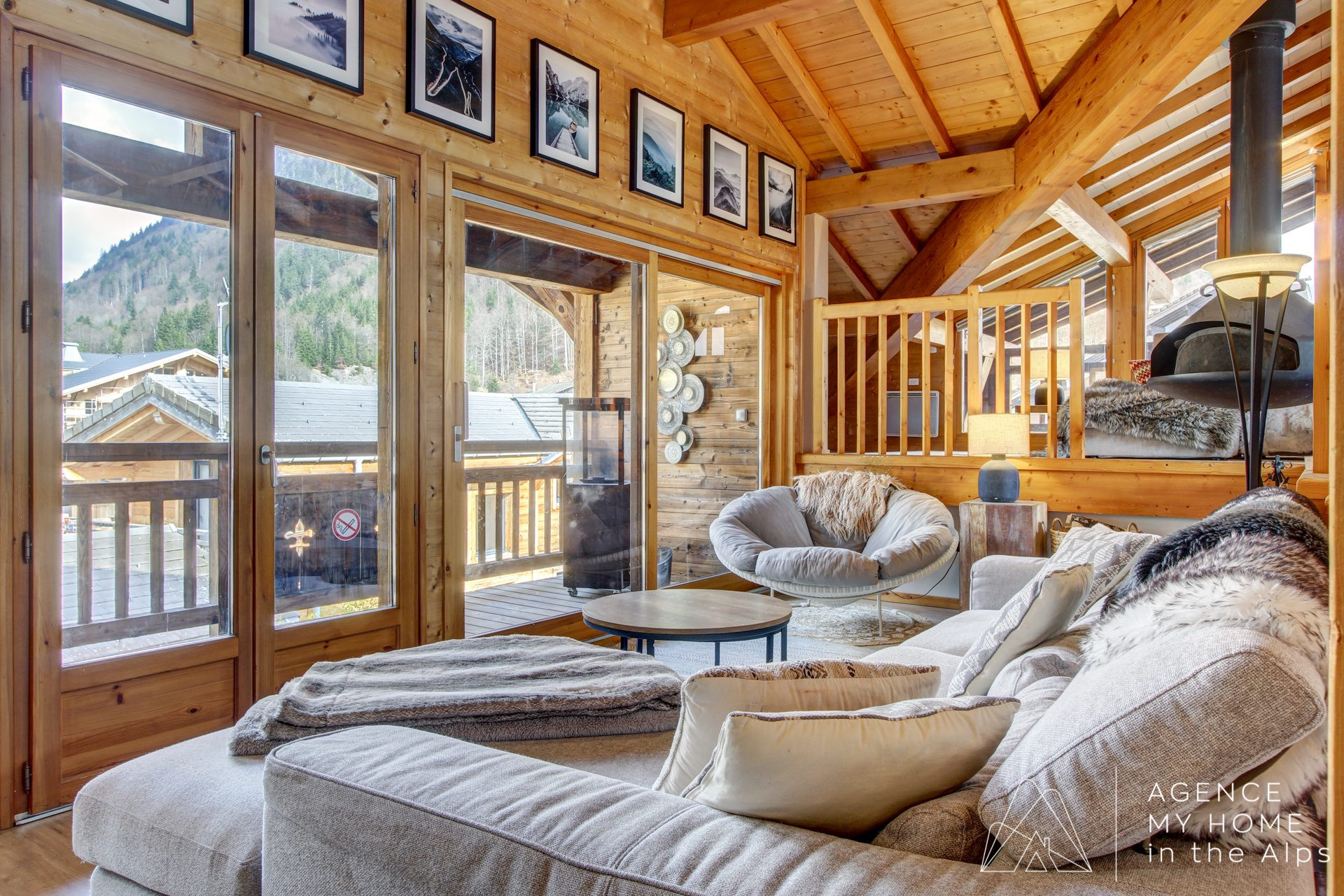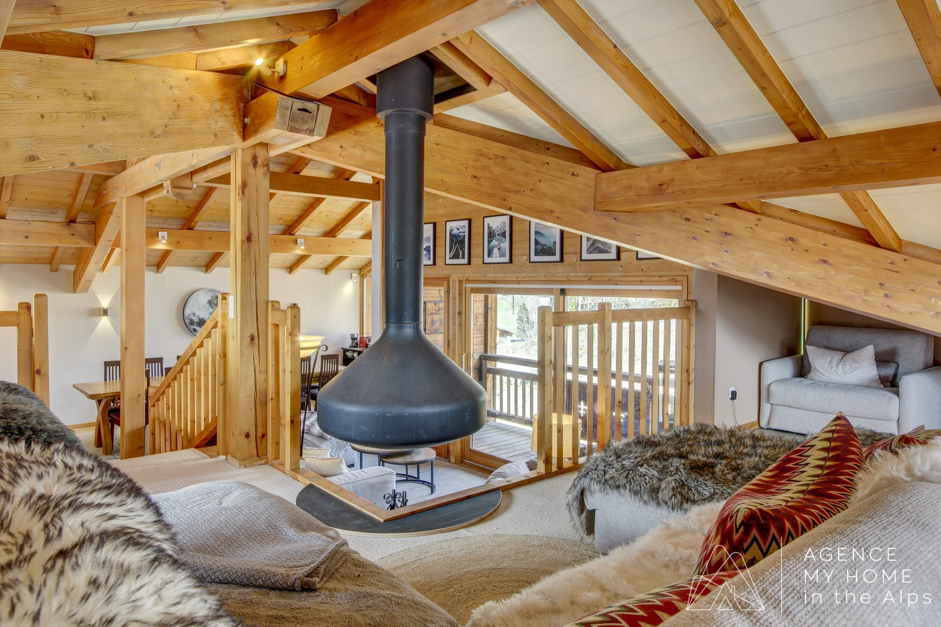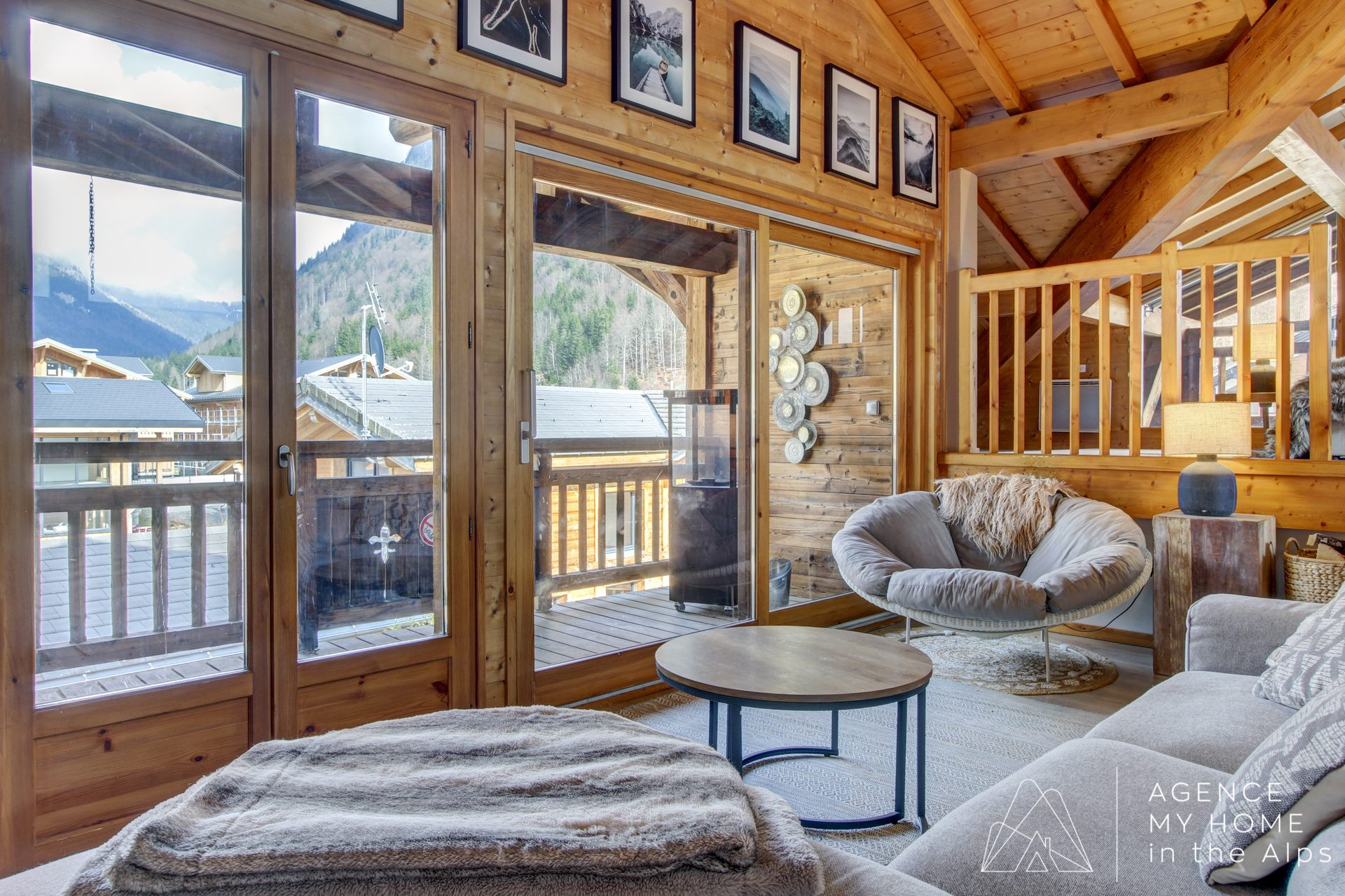 The main living area occupies the top floor, where large windows on three sides bring in plenty of natural light and open onto several balconies. From here, there are wide-reaching views across the Ardent Valley, Roc d’Enfer and towards Montriond and Morzine. A suspended fireplace sits at the center of the room, and the dining area is well positioned to take full advantage of the setting.