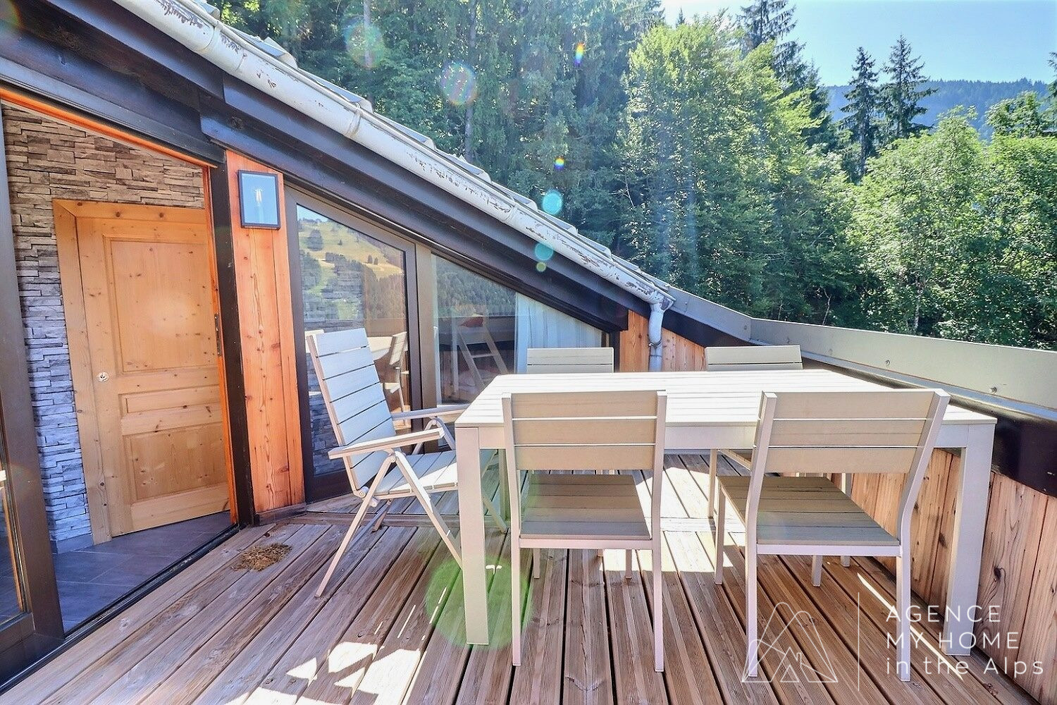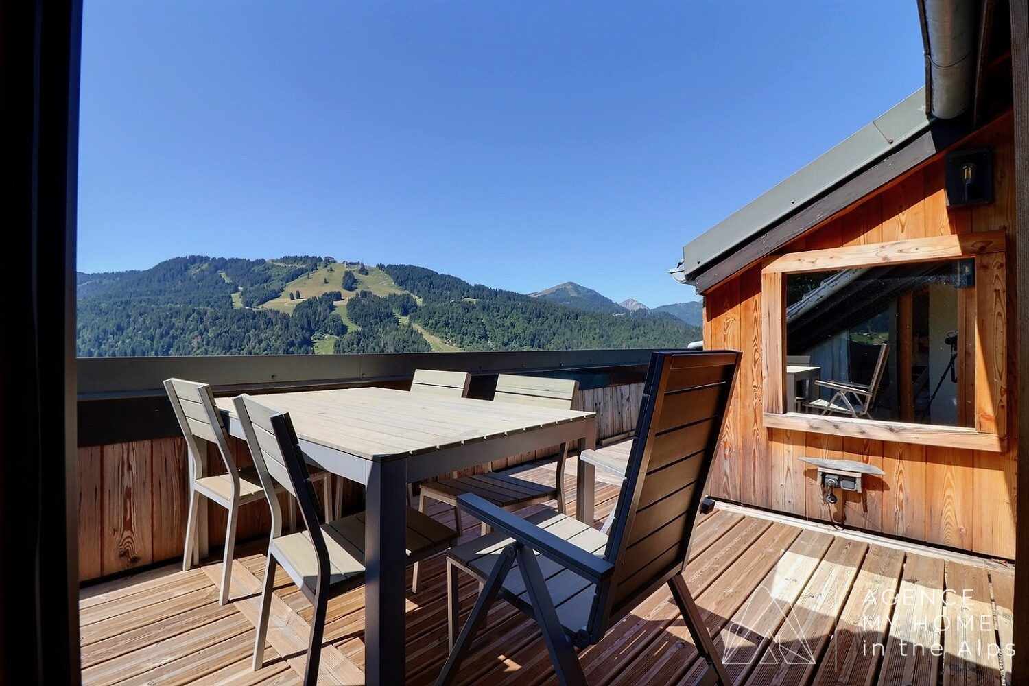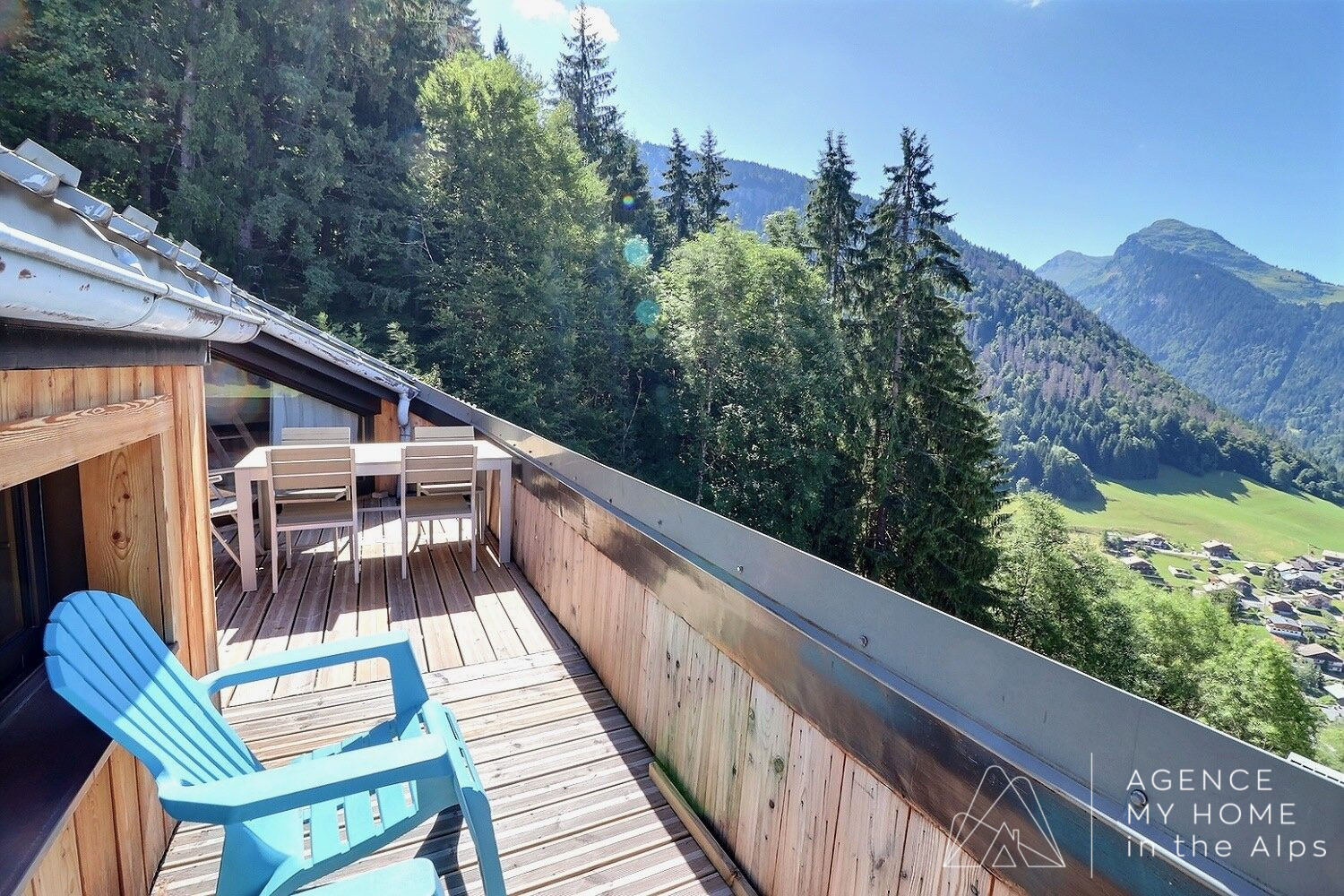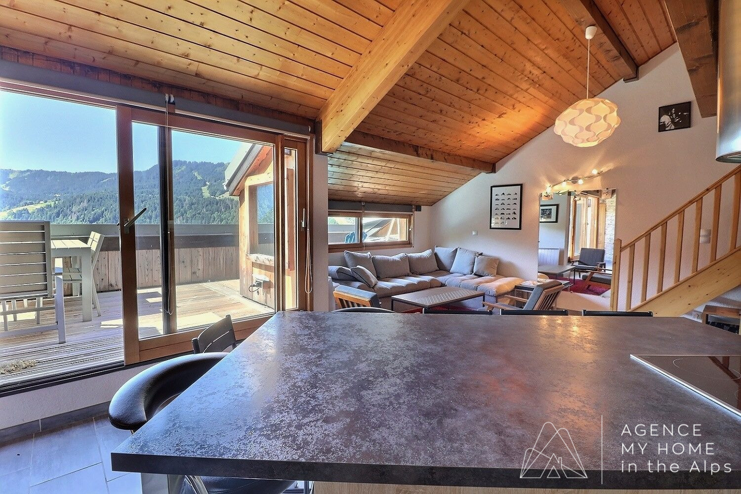 La terrasse est un véritable atout : accessible directement depuis le séjour, elle est très ensoleillée, totalement privée, et offre une vue imprenable sur la forêt environnante. Sans exagérer, c’est l’une des plus belles vues que nous ayons vues depuis un appartement à Morzine.