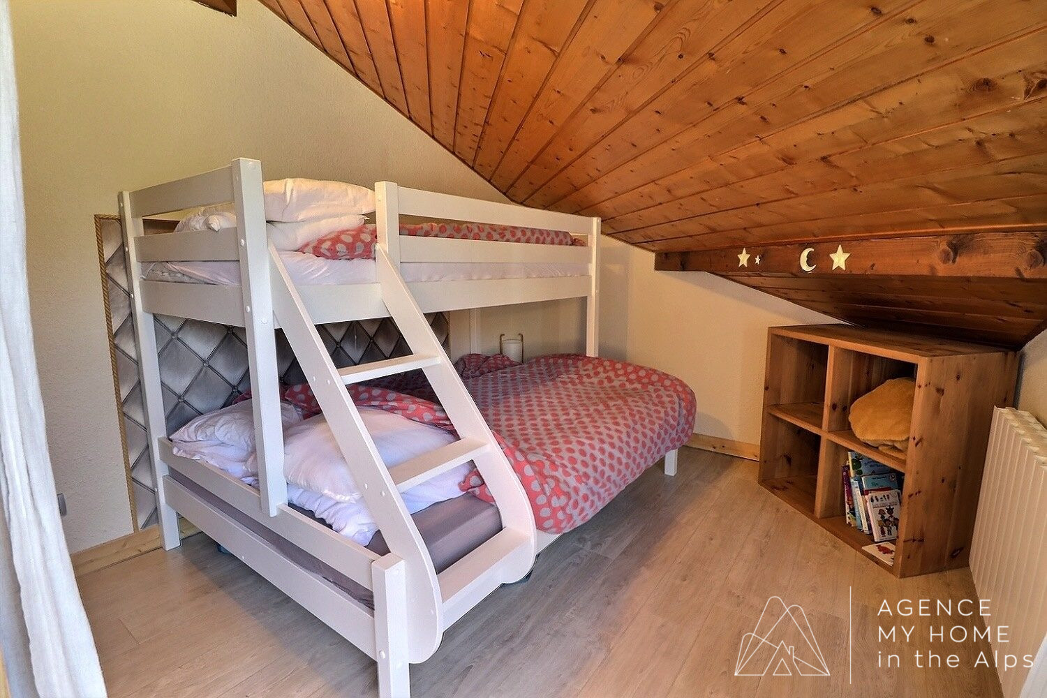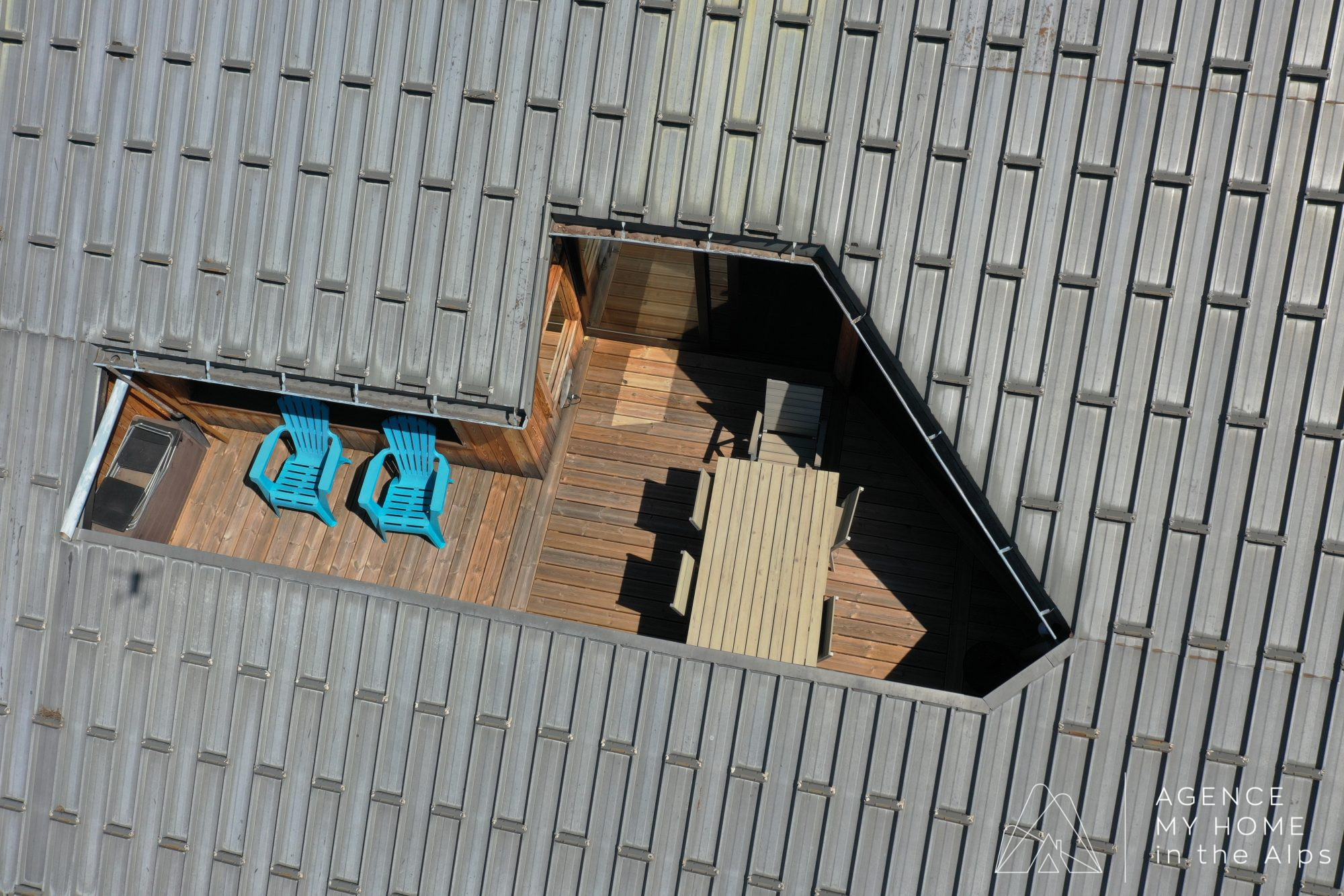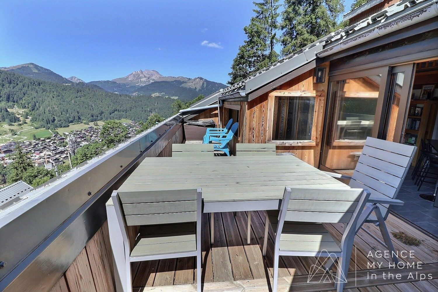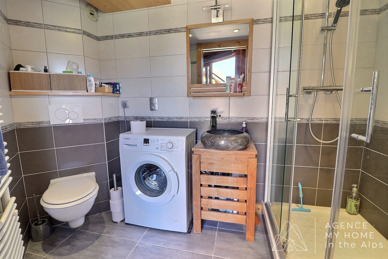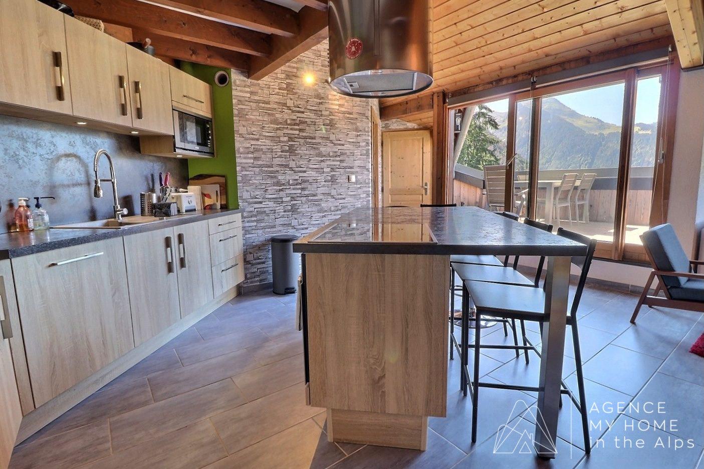La terrasse est un véritable atout : accessible directement depuis le séjour, elle est très ensoleillée, totalement privée, et offre une vue imprenable sur la forêt environnante. Sans exagérer, c’est l’une des plus belles vues que nous ayons vues depuis un appartement à Morzine.