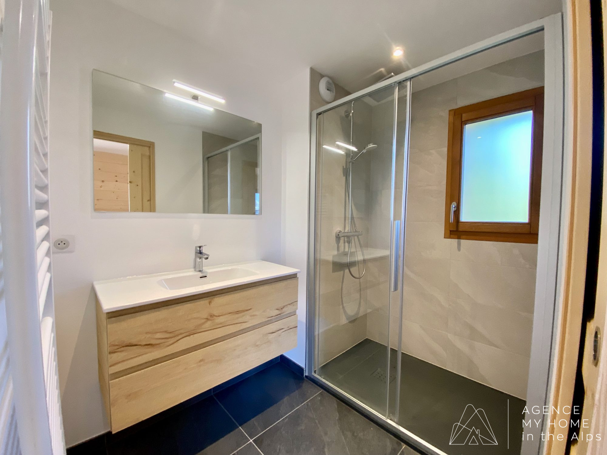 Avec l’appartement se trouve une immense cave, idéale pour ranger de nombreux vélos, ainsi qu’un casier à skis et une place de parking extérieure. L’appartement lui-même est situé au premier étage de la résidence. À l’entrée se trouve un grand espace de vie donnant sur la terrasse et le jardin privatif. À ce niveau se trouvent également la cuisine ouverte sur le séjour, une chambre avec salle de bains privative et un espace de rangement.
