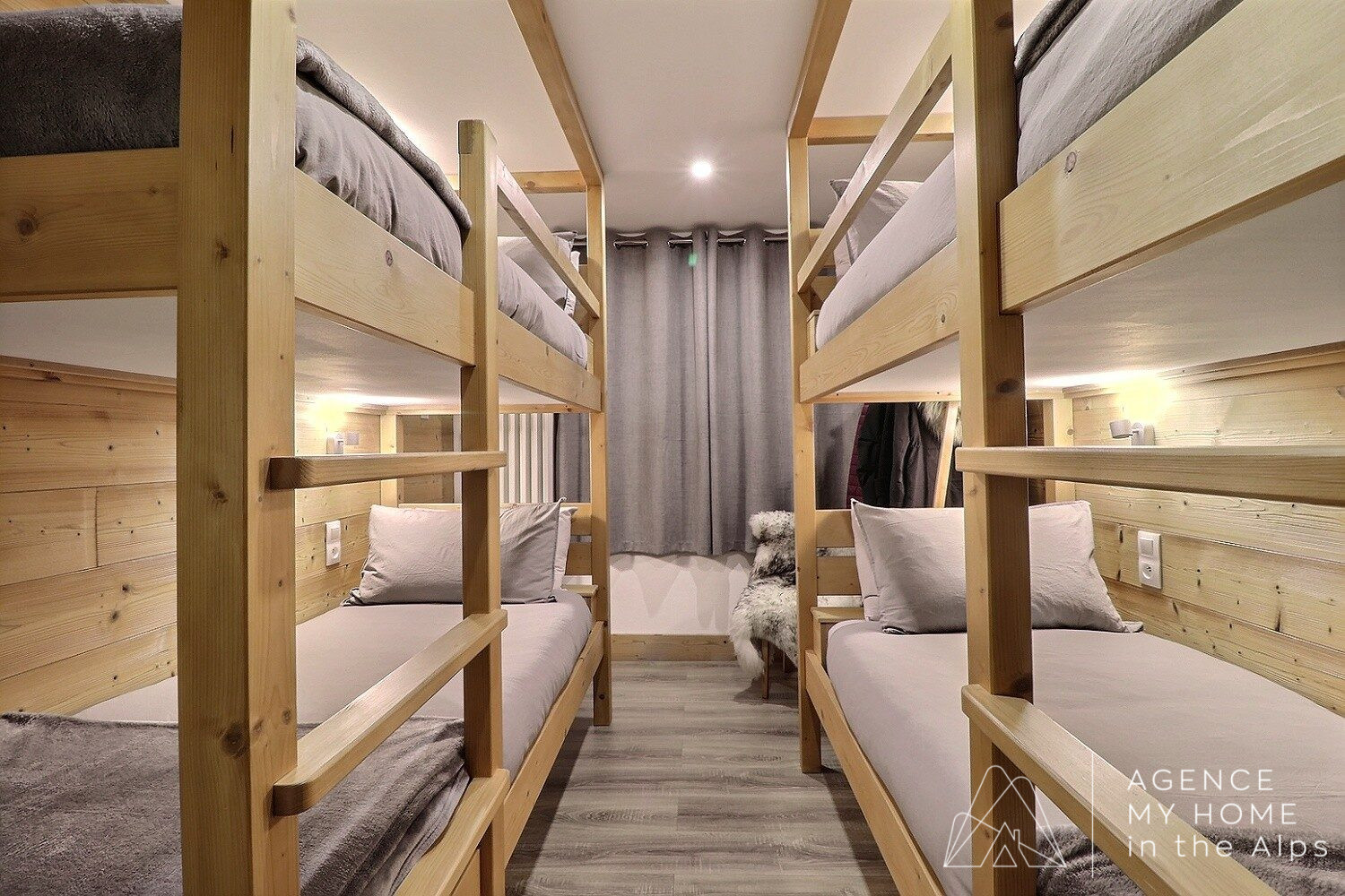 Rez-de-chaussée : stationnement extérieur, un garage avec espace atelier et la chaufferie, un dortoir pour enfants avec deux lits superposés, ainsi qu’un W.C. indépendant.