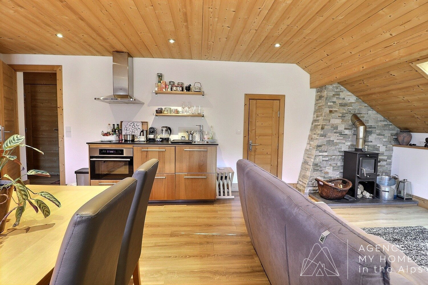 Premier étage : une chambre double avec salle de bains attenante, un salon chaleureux avec poêle à bois, et une cuisine séparée ouvrant directement sur la terrasse. Cet étage comprend également un hammam, un W.C. et une buanderie.