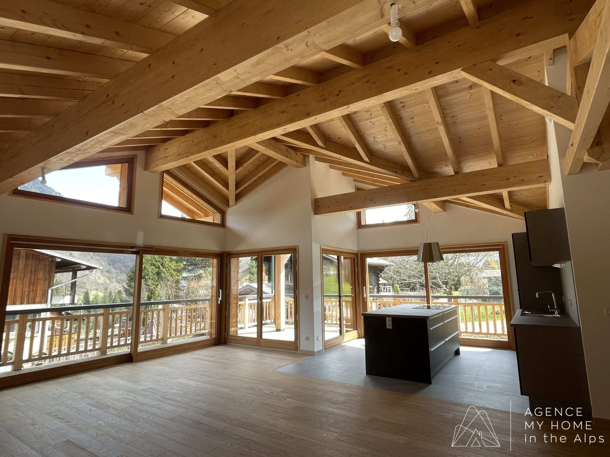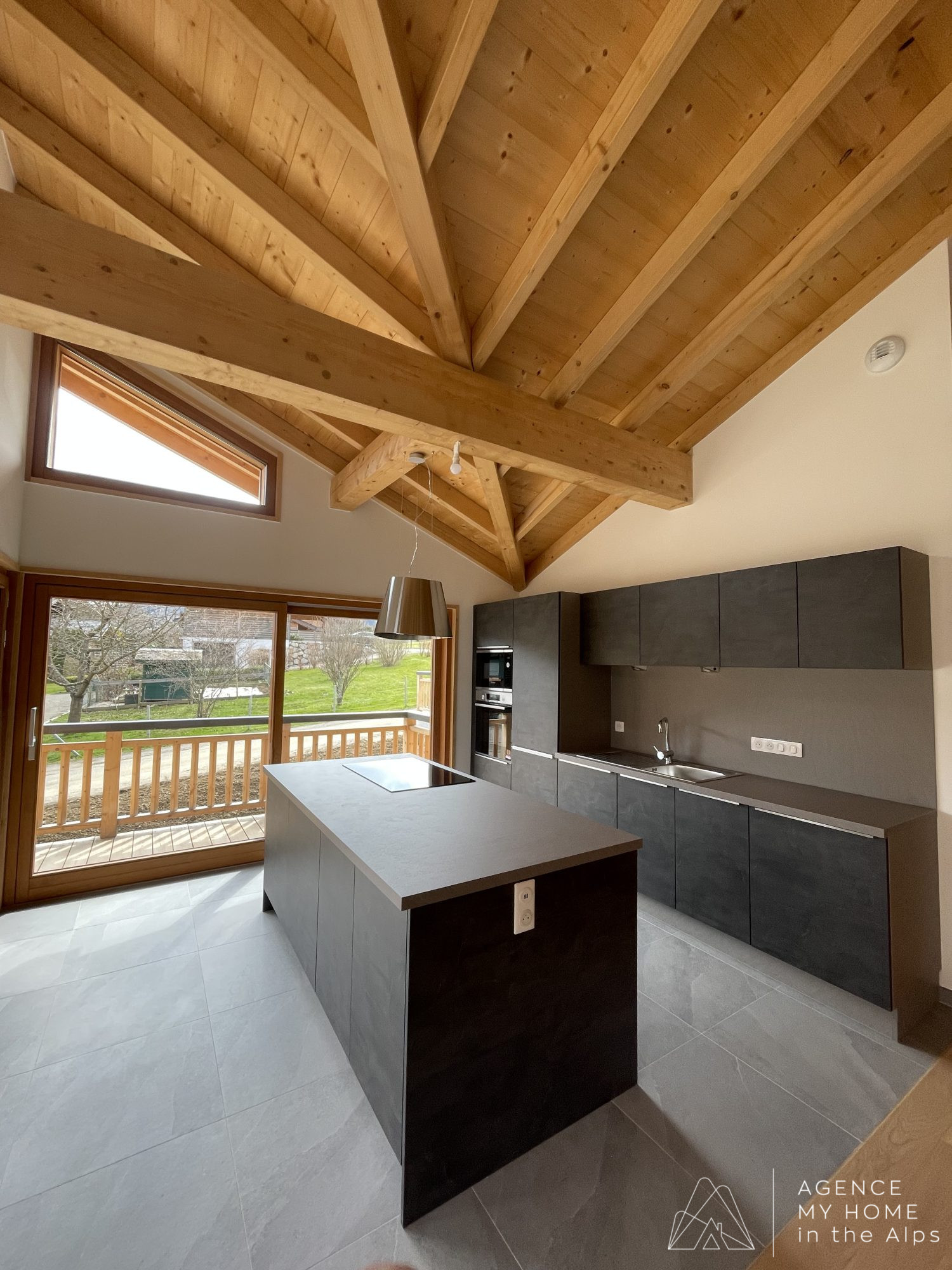 À l’étage principal, la pièce à vivre, baignée de lumière, offre un volume généreux sublimé par une charpente apparente. Vous y trouverez une cuisine moderne entièrement équipée, un salon accueillant, ainsi qu’un accès direct au garage, à l’espace dédié aux skis et à des toilettes indépendantes.