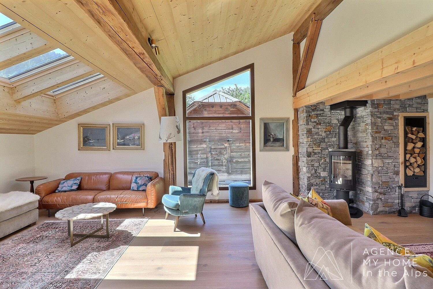 Le chalet bénéficie d’un environnement exceptionnellement calme — sans bruit de route, offrant une intimité totale et sans vis-à-vis depuis la terrasse supérieure. À l’extérieur se trouvent également un mazot traditionnel (avec étude de faisabilité pour sa conversion) et un petit jardin. À l’arrière, la propriété est bordée de terres agricoles où paissent des chevaux. Sous réserve d’accord avec le propriétaire, il serait également possible d’acquérir un verger attenant de 300 m².