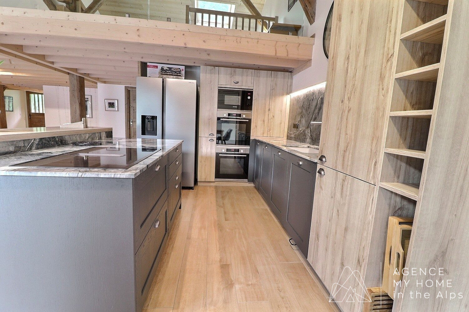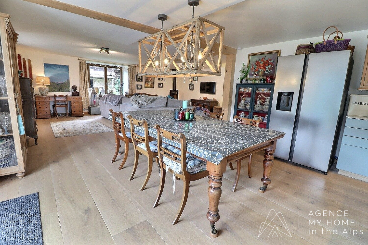 Cuisine entièrement équipée ouverte sur un lumineux espace repas, menant à un salon convivial avec poêle à bois