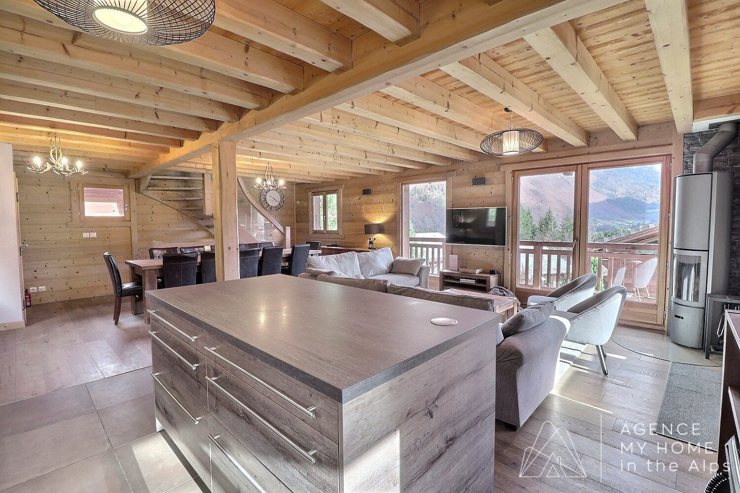 L’espace de vie principal occupe le premier étage et a été pensé pour recevoir confortablement familles et groupes. La cuisine, spacieuse et entièrement équipée, est un lieu convivial qui s’ouvre directement sur une terrasse ensoleillée le matin et à la mi-journée. De là, vous pourrez profiter d’une vue panoramique sur les montagnes, notamment depuis le jacuzzi. Un poêle à bois et un W.C. complètent ce niveau.