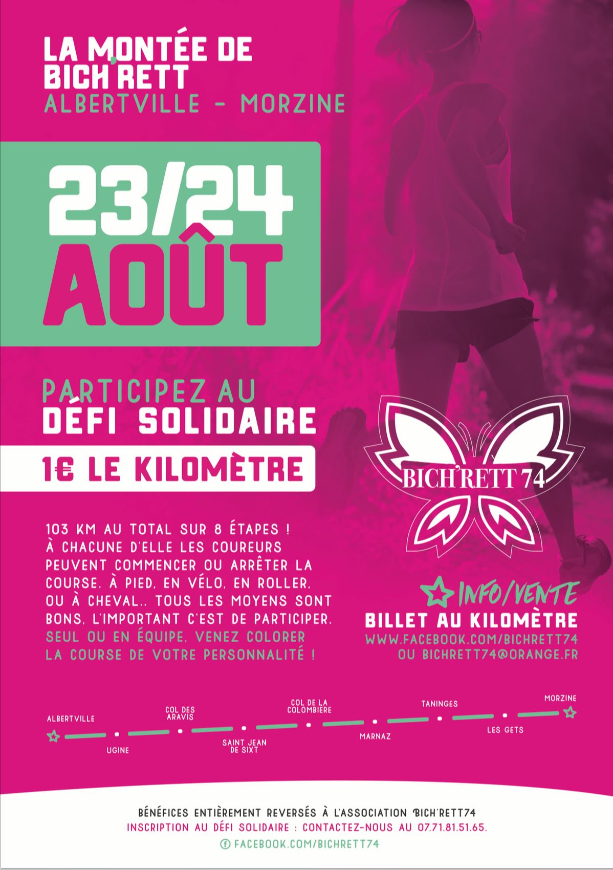 Une course, une journée, des coureurs et de l’entraide ! Un défi solidaire ouvert à tous… Aidez l’association Bich’rett74 à faire traverser les cols à leur mascotte et à faire connaitre le syndrome de RETT, participez au défi sportif qui va relier Albertville à Morzine. Plus d’infos: bichrett74@orange.fr
